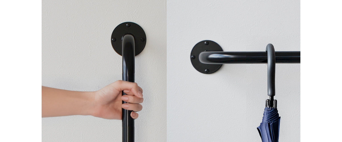 連結や折りたたみ等の機能を排した、継ぎ目のないミニマルな鉄ハンガーパイプ。 金属の質感を抑えたマットブラックの塗装と、シームレスでスムース、太すぎないアイアンバーは、必要以上の主張せず、屋内のオープンな場所に設置しても、他のインテリアと調和させやすいです。 大量生産ではなく、少量を丁寧に生産して下さる日本国内の協力工場による溶接は、見た目の美しさを持ちつつ、耐荷重20~30kgもの高剛性を発揮します。(ロープタイプを除く。)