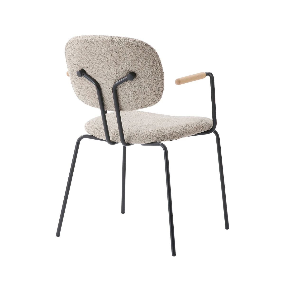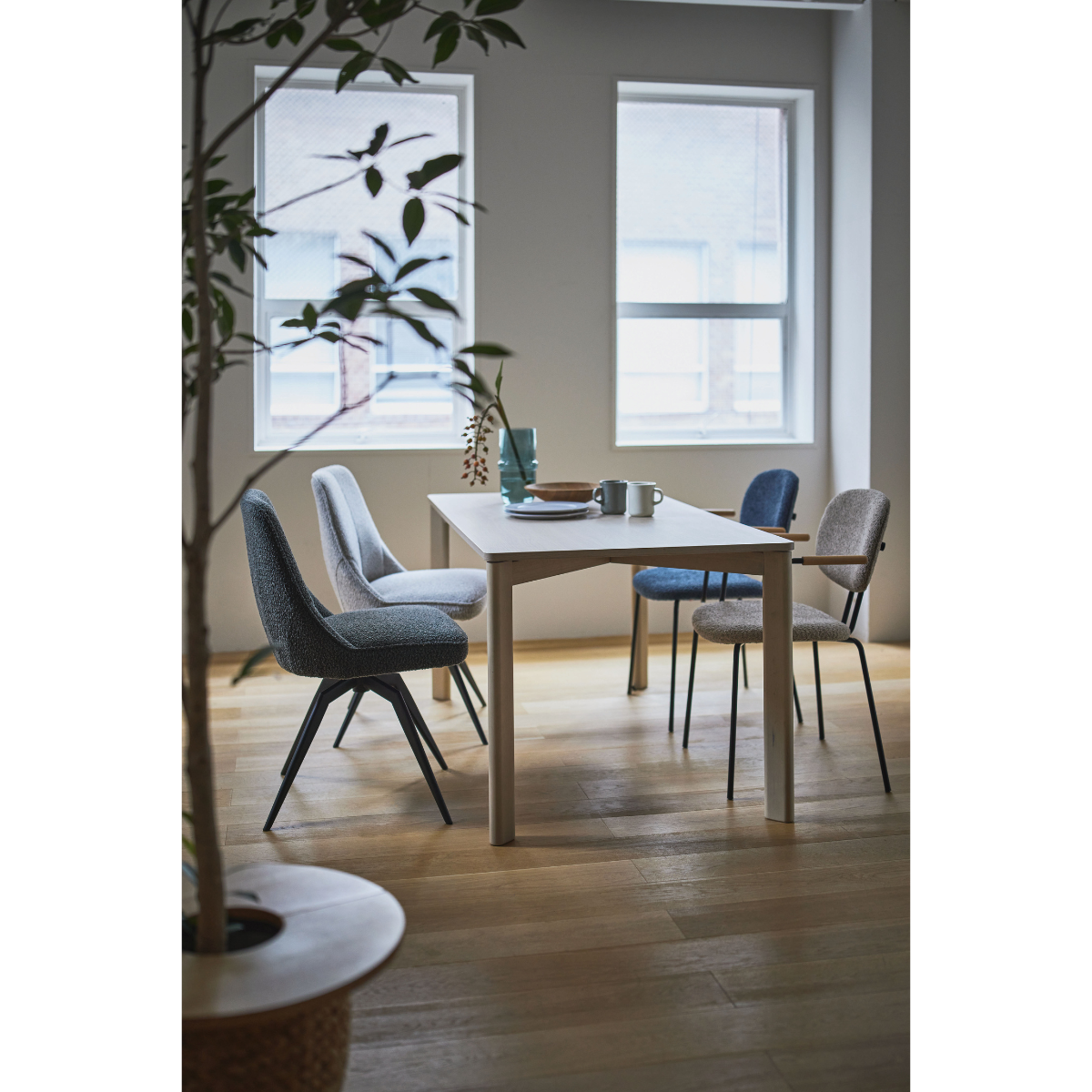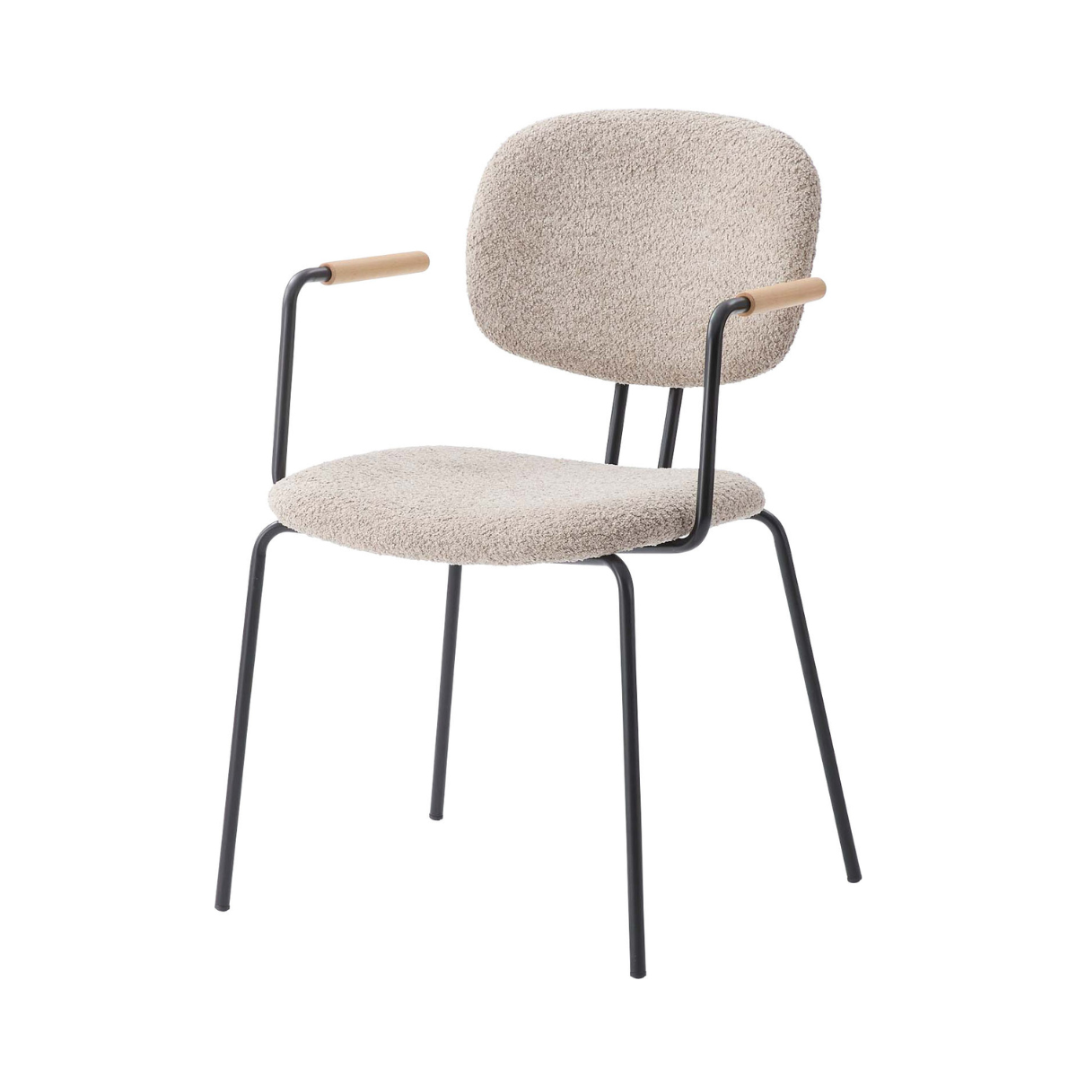 背面とアーム部分に個性的なデザインを施したアームチェア。素材やディティールにもこだわり、唯一無二な存在感のある仕上がり。使いやすいさ、快適さを追求したデザイン。座面と背もたれのカーブが身体にフィットし、座りやすさをサポート。しっかりと硬さのあるクッションで、長時間座っても疲れにくい設計。細身でエッジの効いたスチール脚が、スタイリッシュな雰囲気を演出。ファブリックは人気の高いブークレ生地を採用。