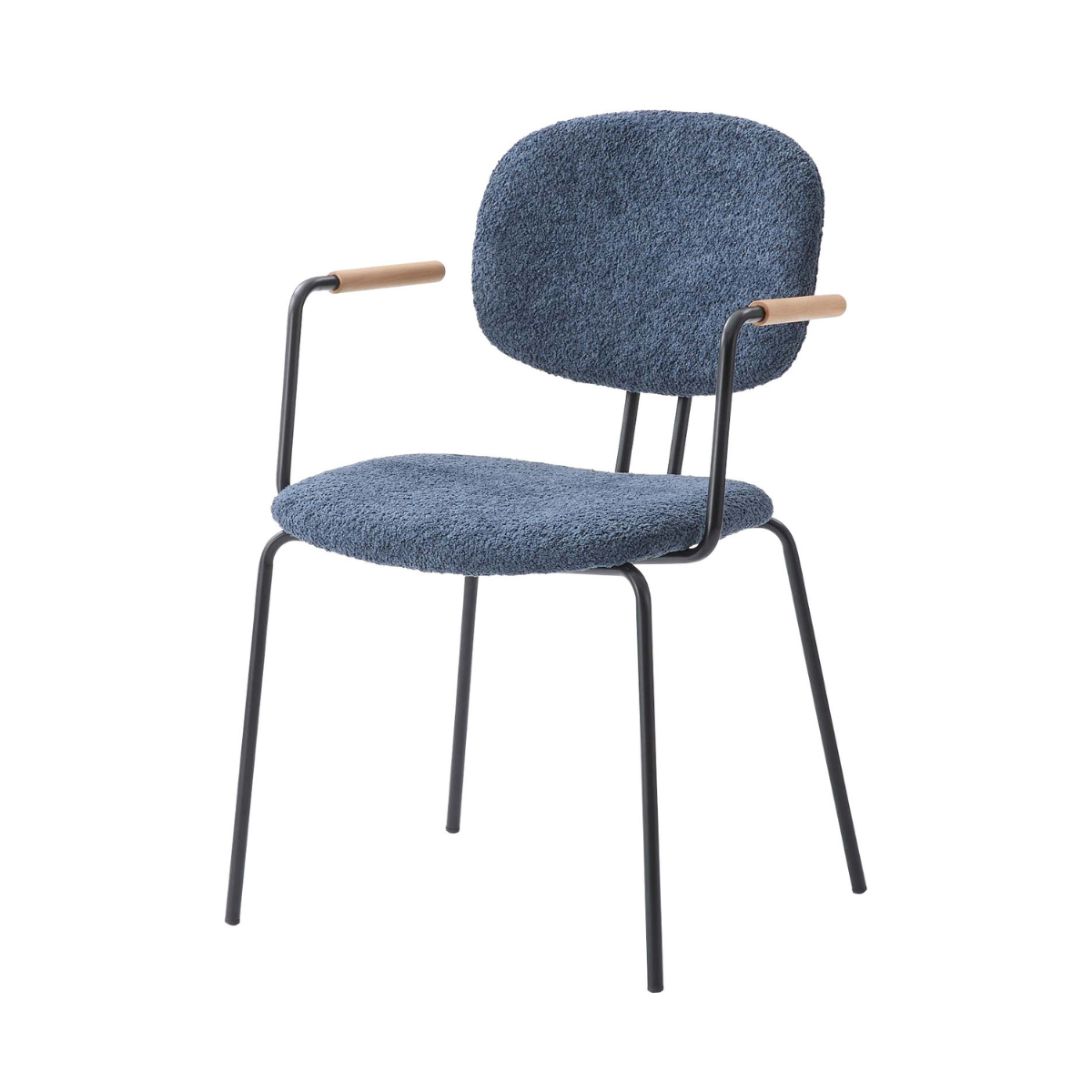 背面とアーム部分に個性的なデザインを施したアームチェア。素材やディティールにもこだわり、唯一無二な存在感のある仕上がり。使いやすいさ、快適さを追求したデザイン。座面と背もたれのカーブが身体にフィットし、座りやすさをサポート。しっかりと硬さのあるクッションで、長時間座っても疲れにくい設計。細身でエッジの効いたスチール脚が、スタイリッシュな雰囲気を演出。ファブリックは人気の高いブークレ生地を採用。