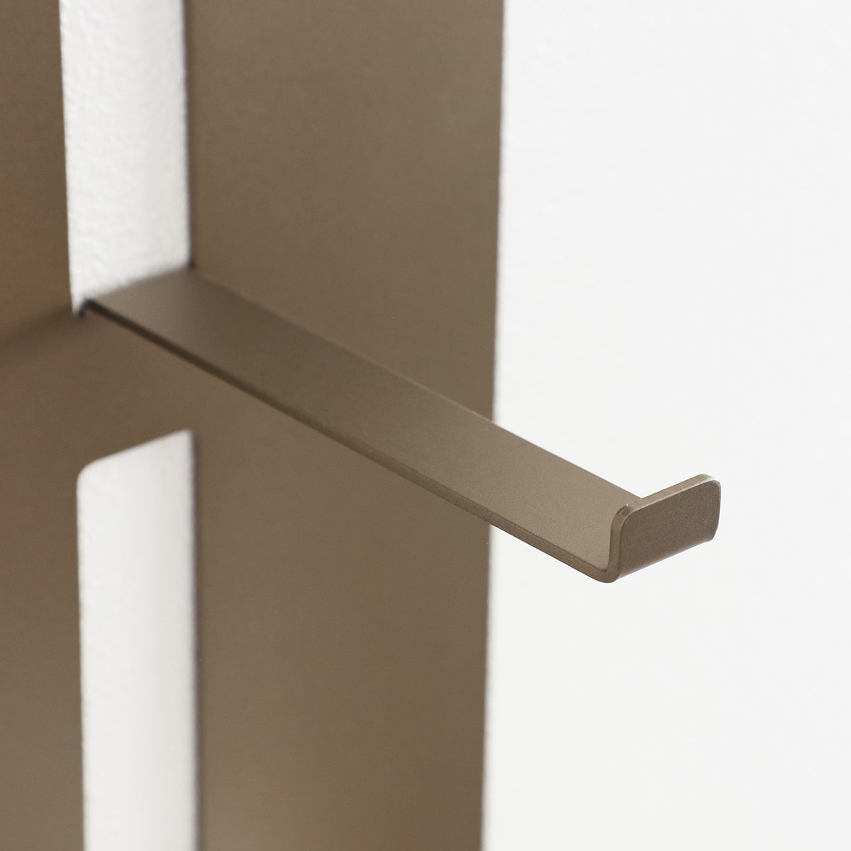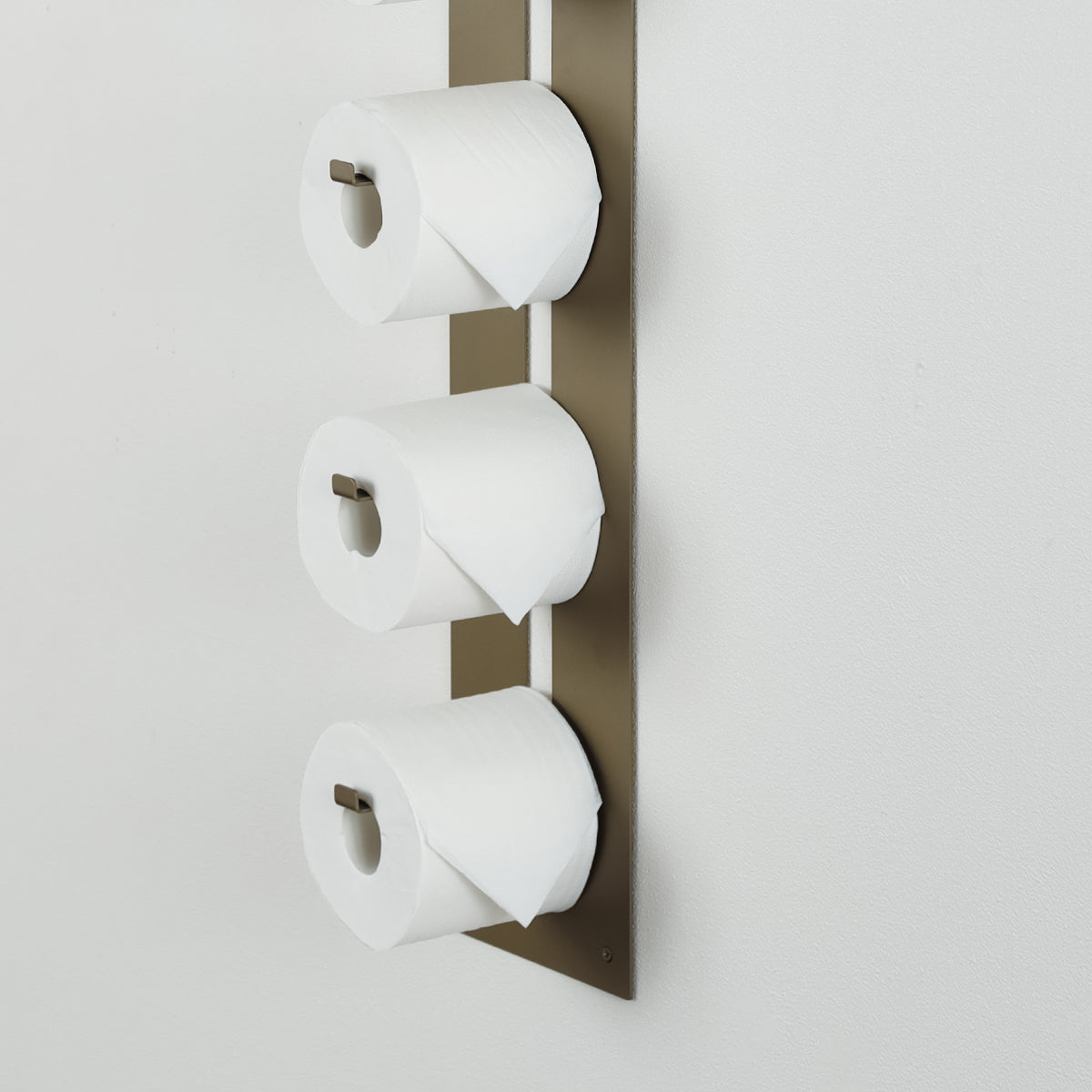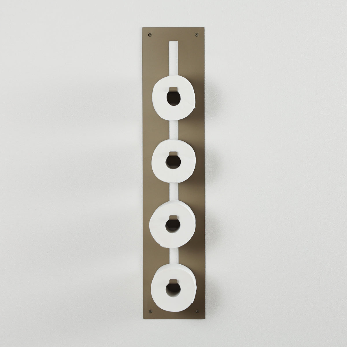 壁面取付のトイレットペーパーを4つまで壁掛け出来るトイレットペーパーストッカーです。トイレットペーパーの穴にホルダーのフック部分を通すだけなので、かんたんに出し入れが可能です。